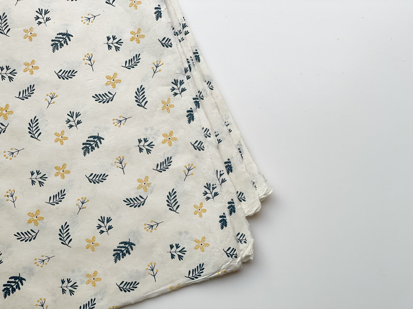 This design features beautiful forest leaves in deep indigo blue against the natural loktaa beige paper. The rich design against the natural paper gives makes the gift wrap look very simple but gorgeous. Looks even more pretty when gift wrapped! Our designs has been screen-printed on to this special Nepalese handmade paper.
