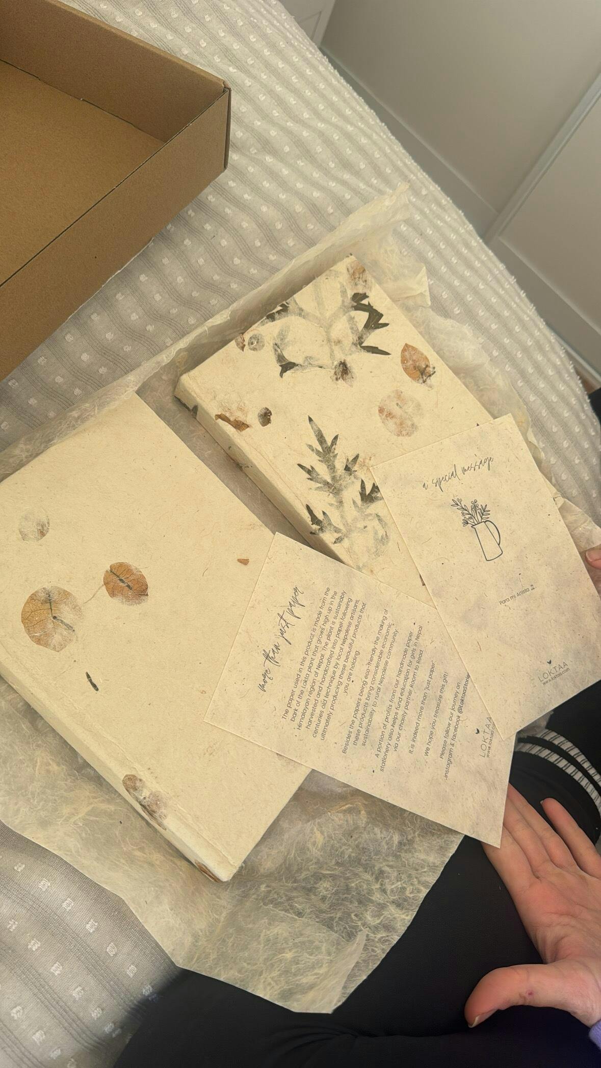 - Handmade paper, hand-stitched binding