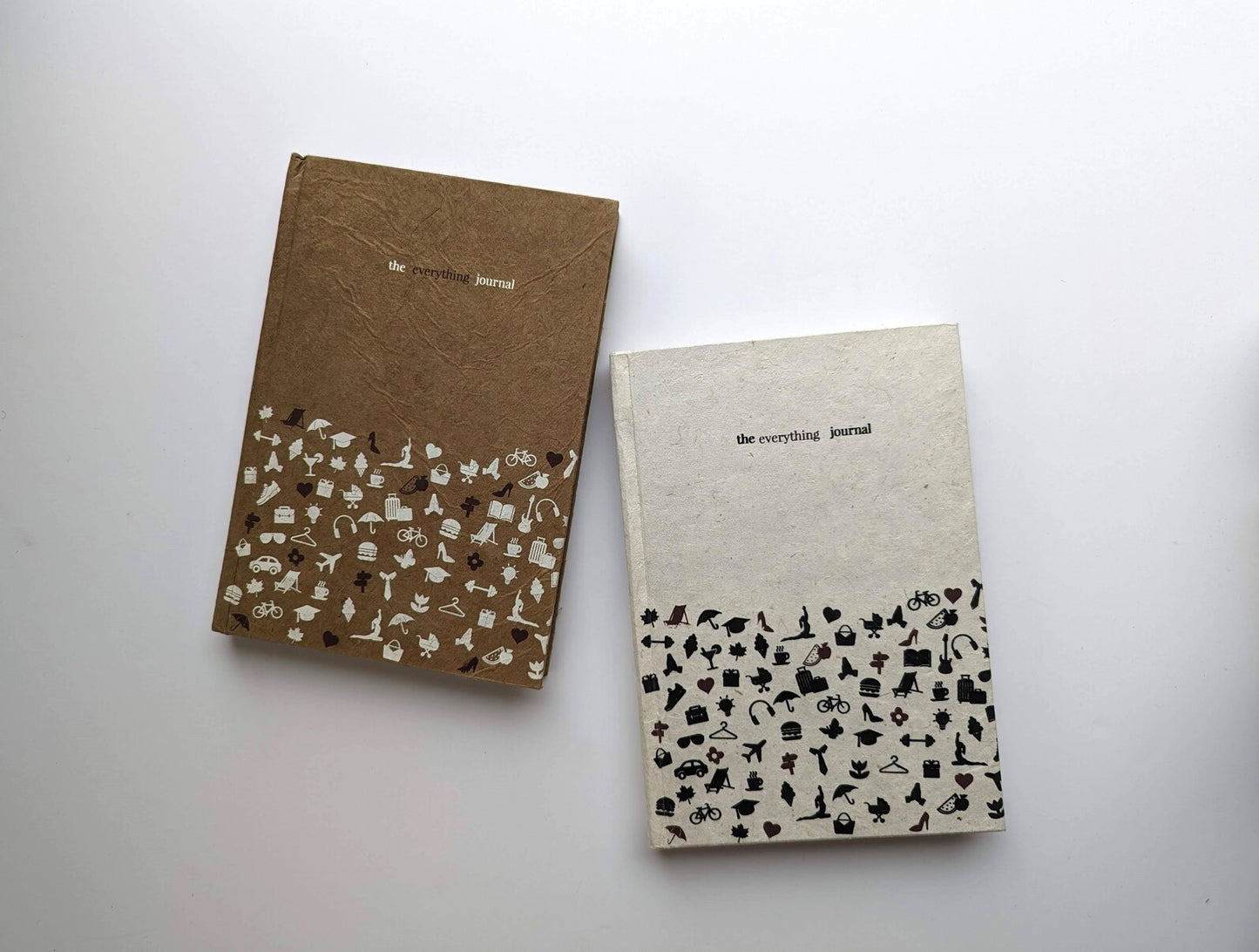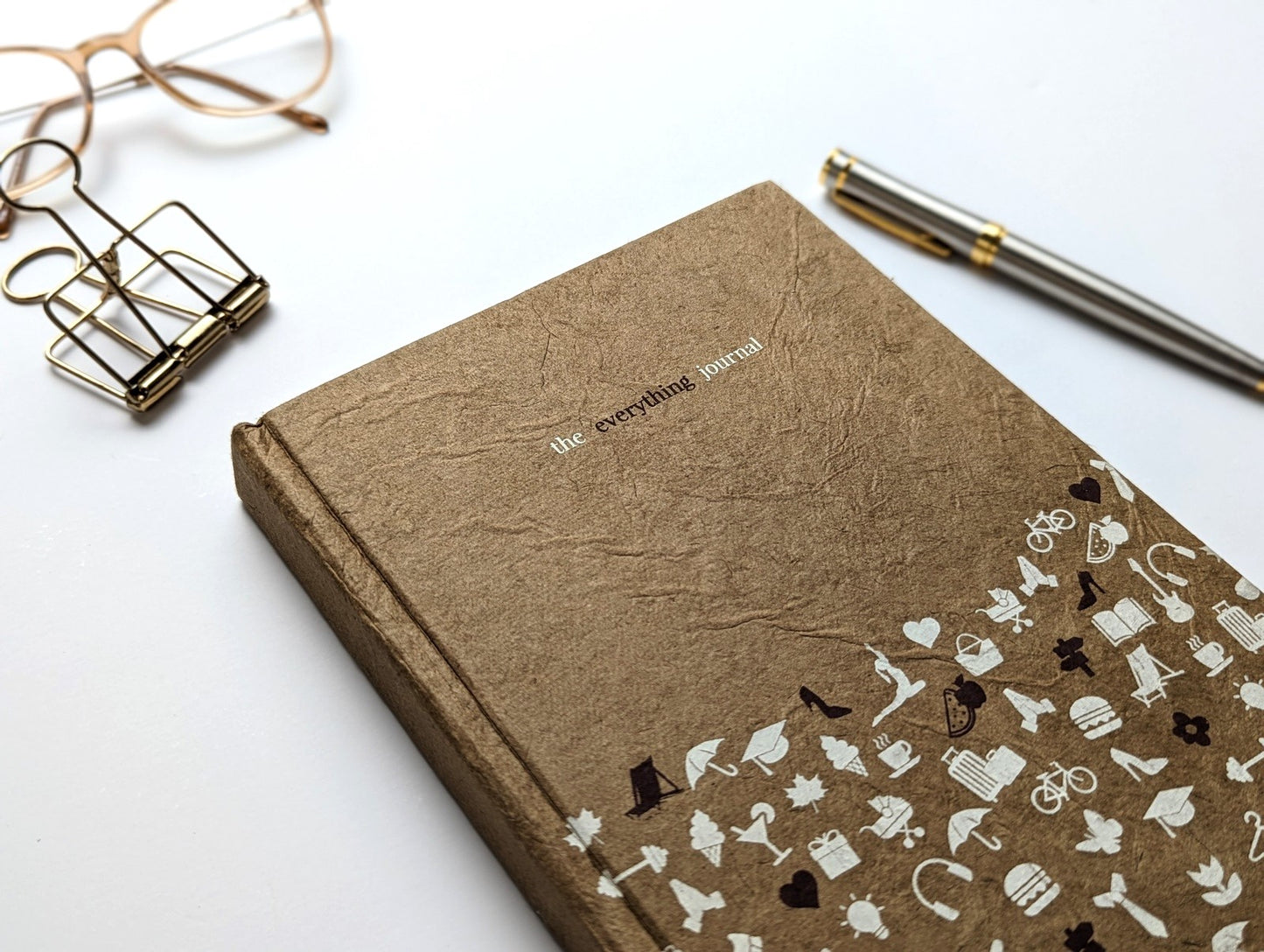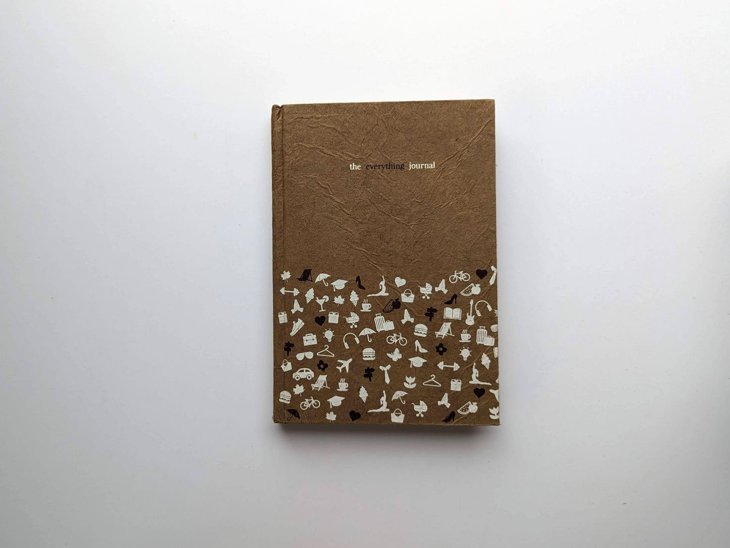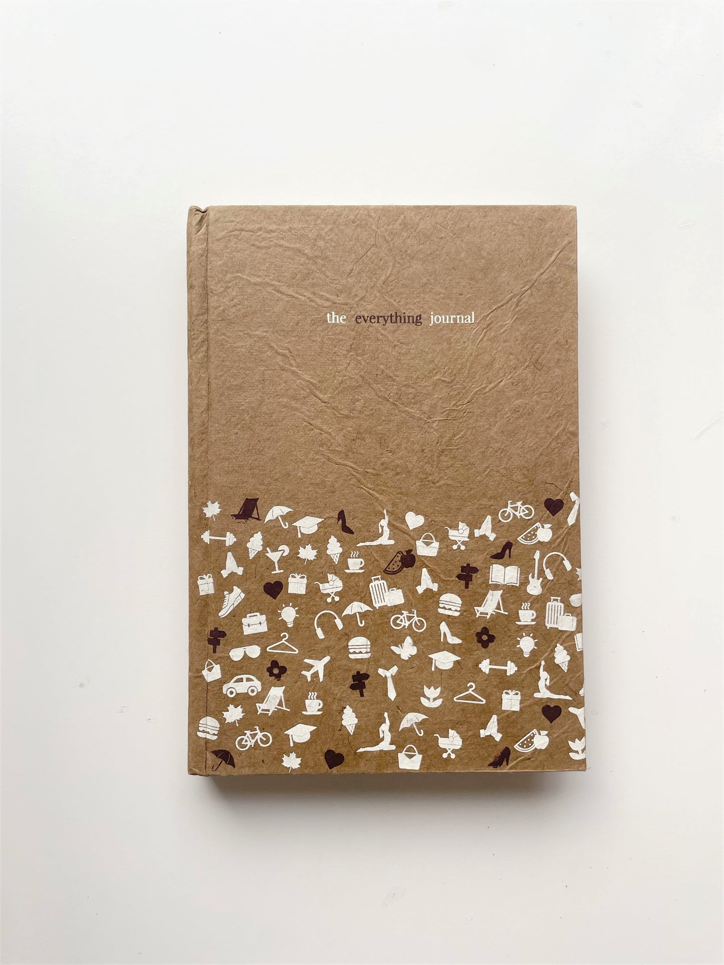 This journal features a hardcover in warm brown vegetable dyed LOKTAA paper with a unique screen-printed on the cover, titled 'The Everything Journal'.